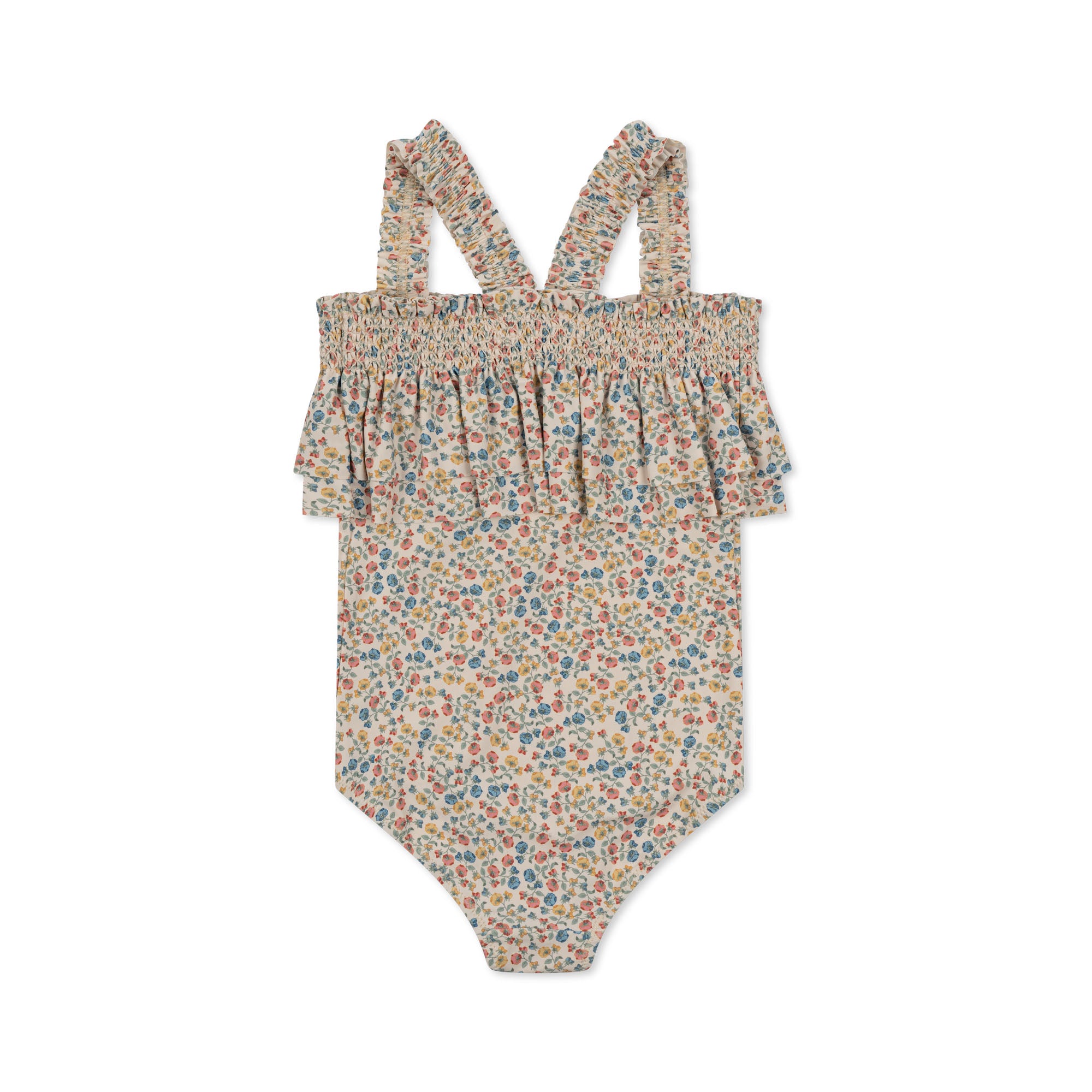 Het badpakje heeft lieve rushes rondom. De maatjes 18M & 2Y hebben drukknopjes onderaan zodat het verluieren gemakkelijk kan.