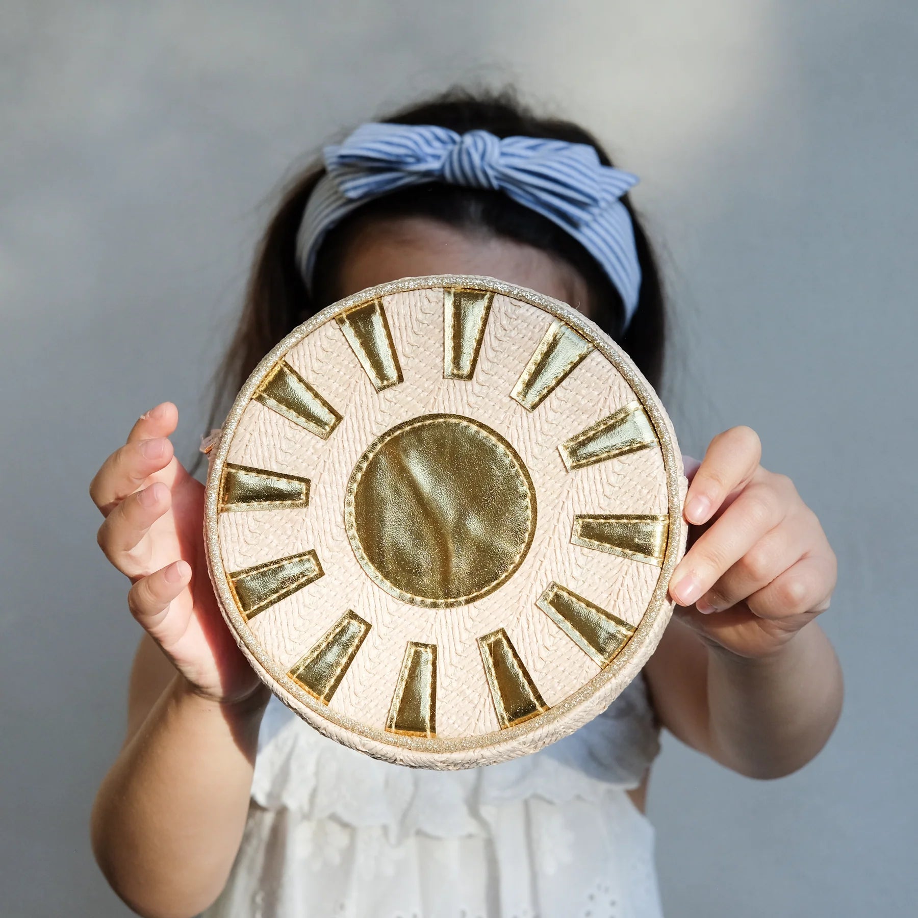 - 3D ronde tas gemaakt van geweven stof in raffiastijl met een glanzende gouden metallic zonneschijn